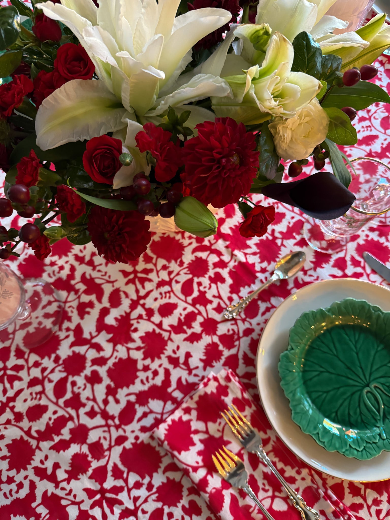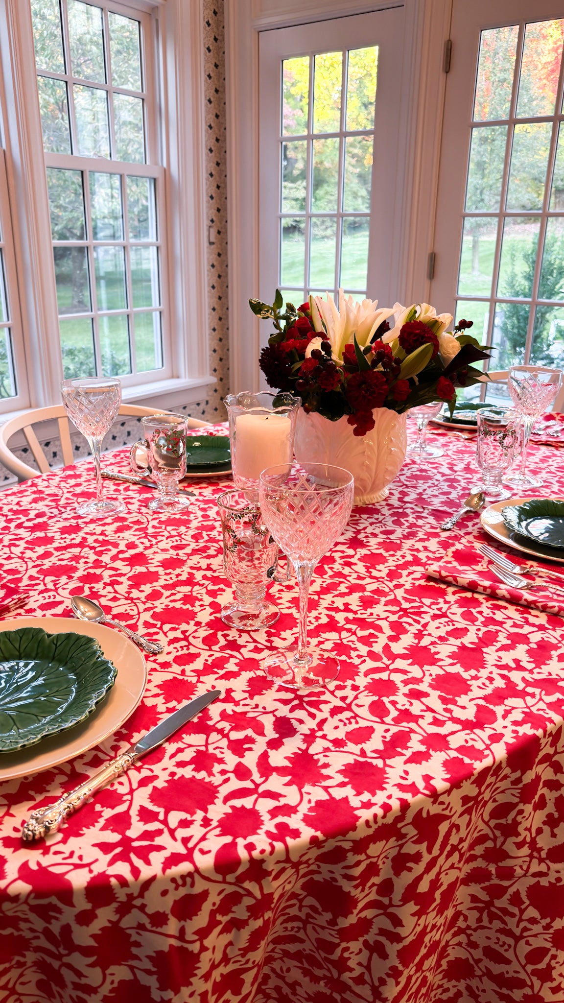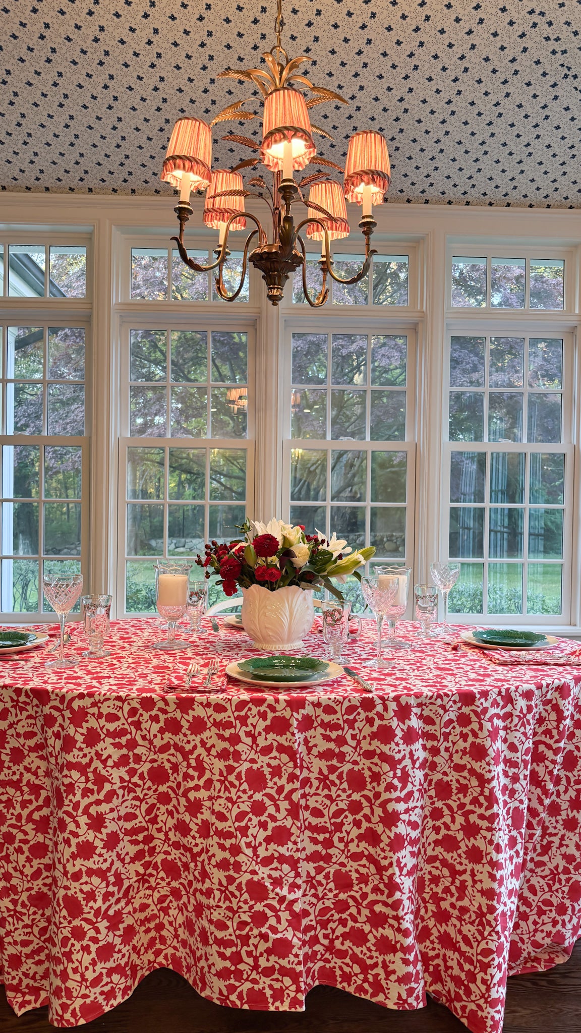This hand block-printed tablecloth from our debut linens' collection in a vibrant and timeless Nantucket red hue offers a fresh and beautiful start to the al fresco season. Pair it with holiday tones and you have year-round versatility.