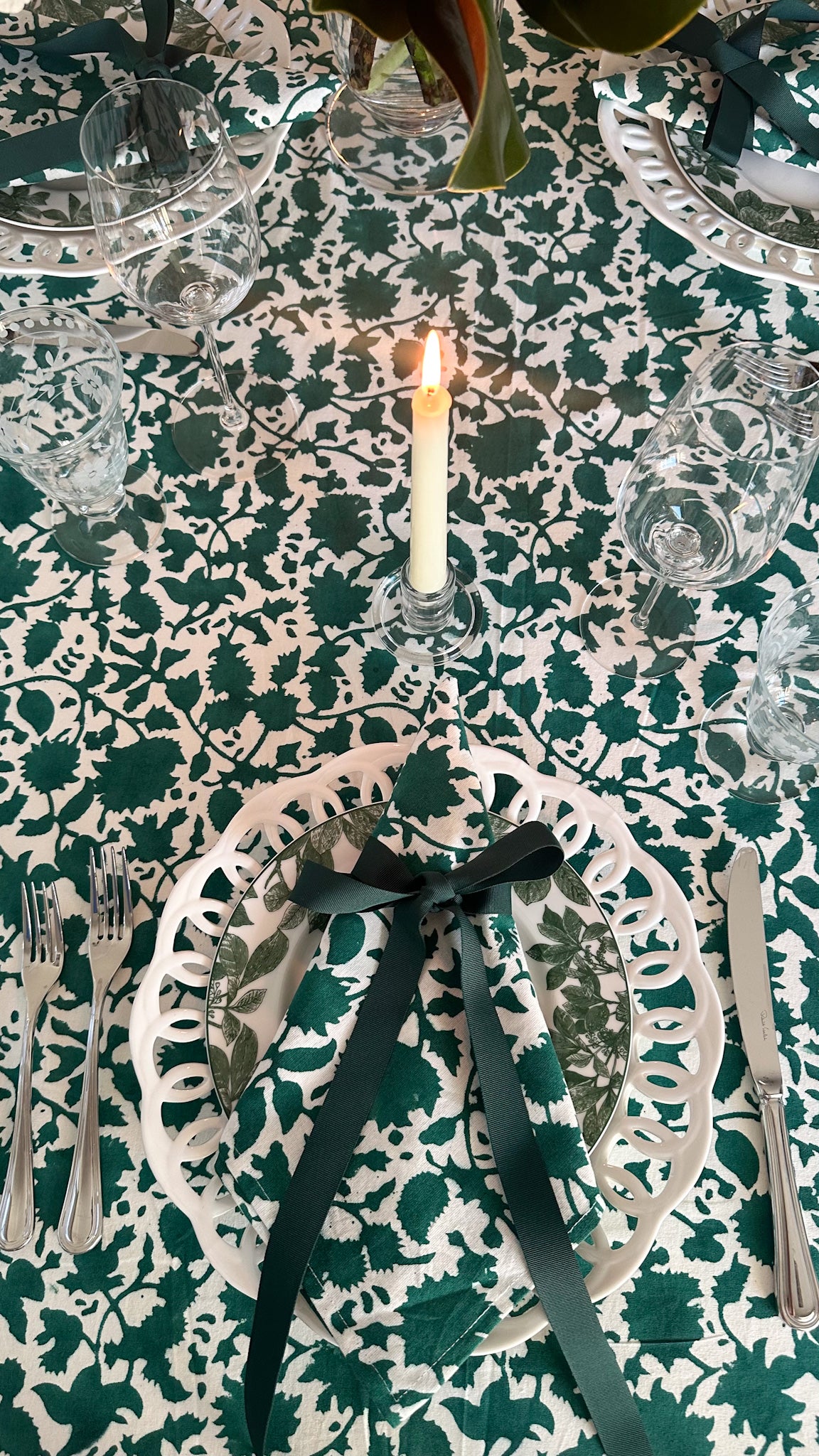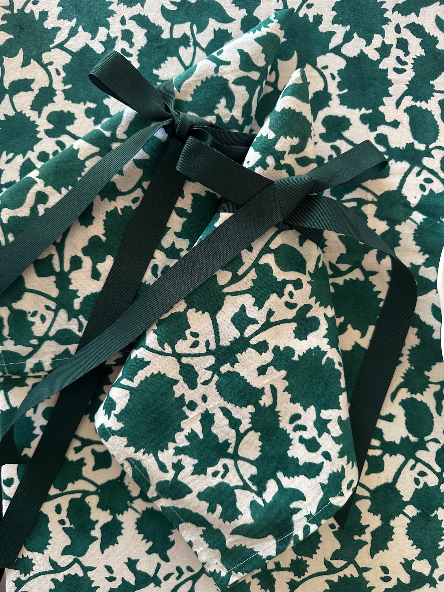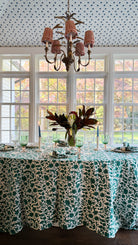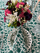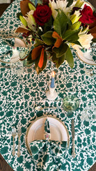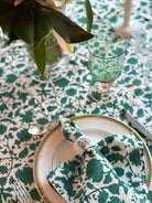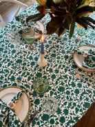 A classic forest green, this hand block-printed tablecloth is the perfect foundation for a festive, moody tablescape that pairs well with beautiful magnolia, cream florals, soft blues and more.