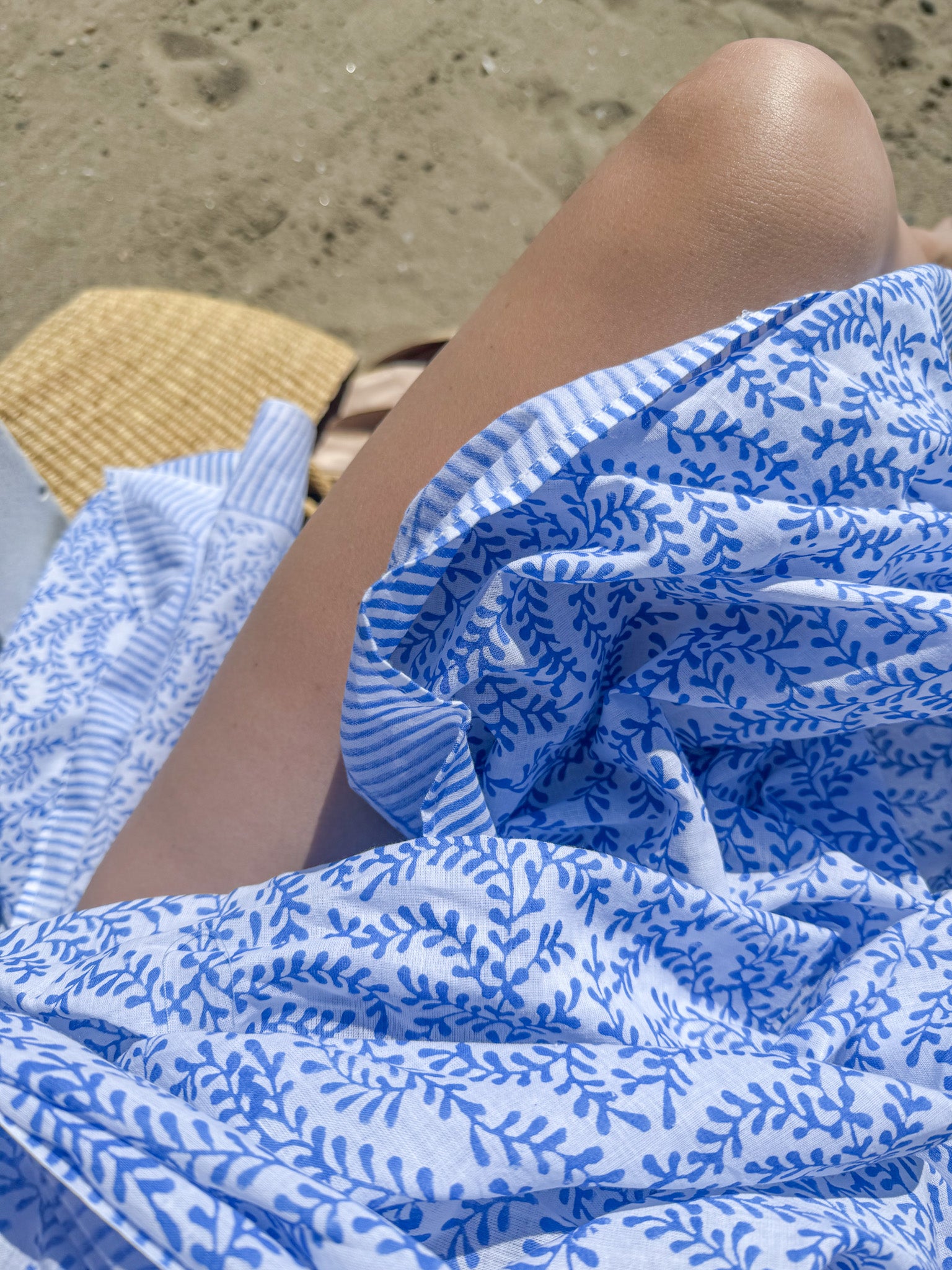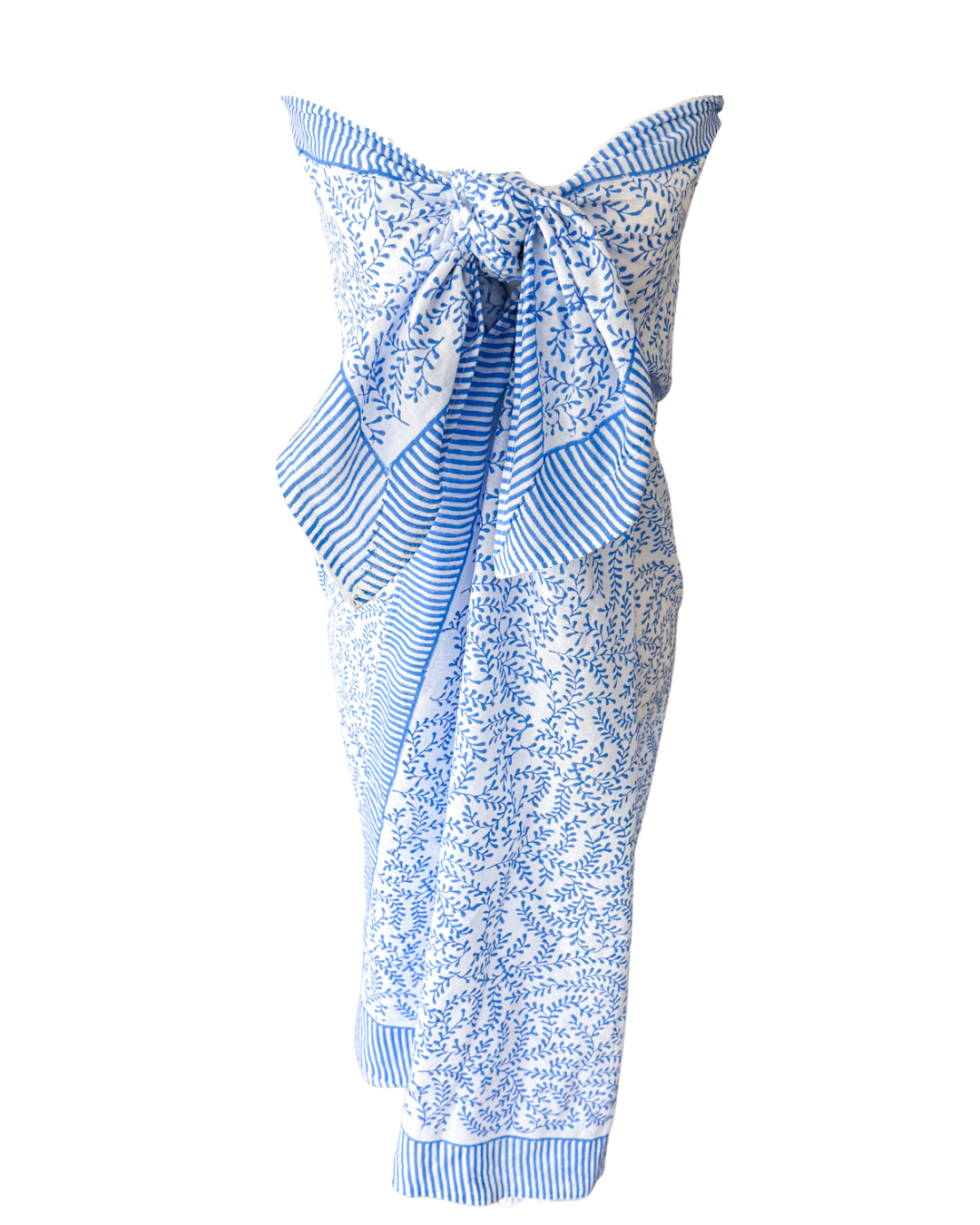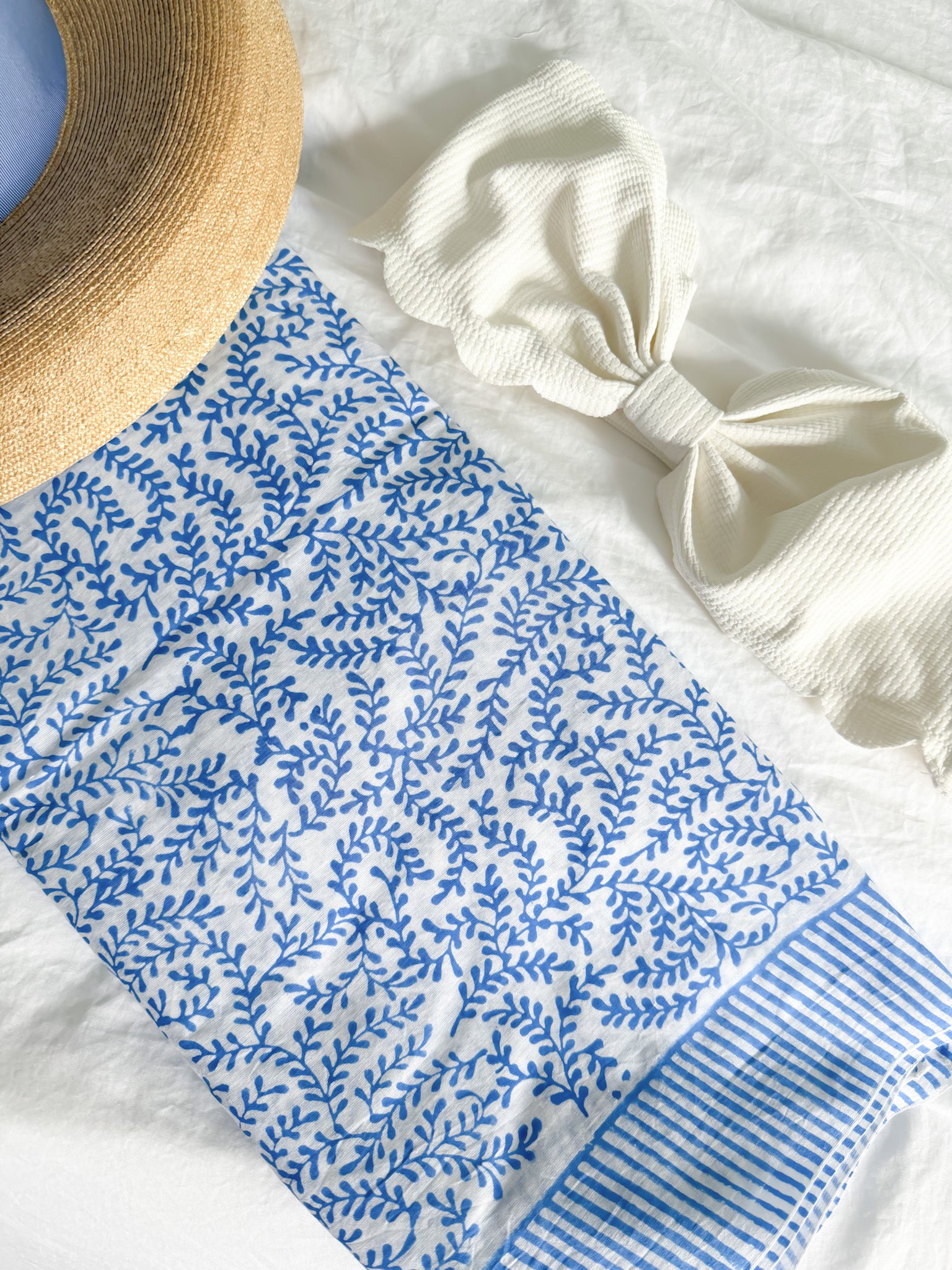 Meet our custom, fully hand-blocked Cerulean Fern print. This classic motif in the perfect shade of blue with timeless stripe border can be worn multiple ways—taking you from the oceanside to sunset spritzers.