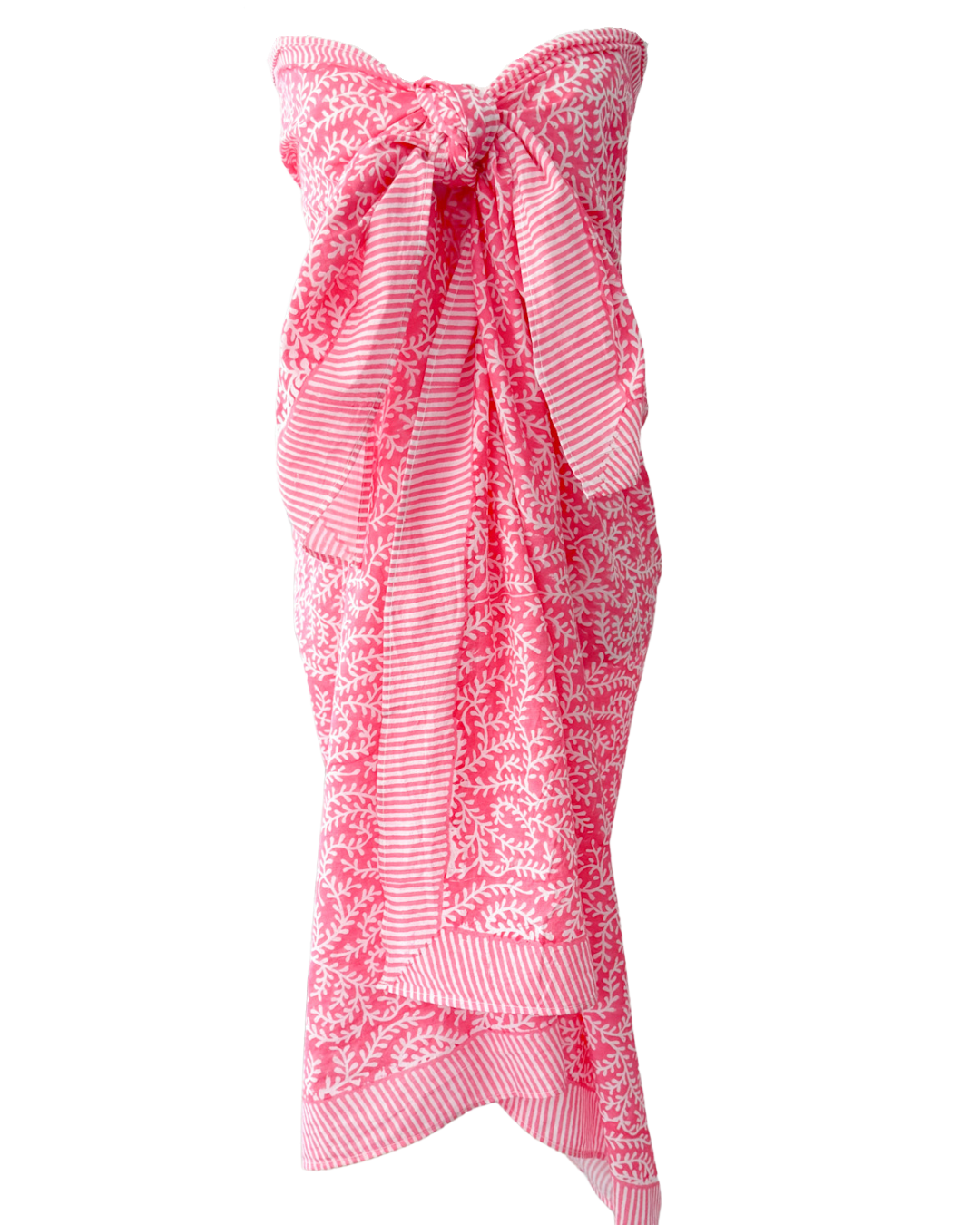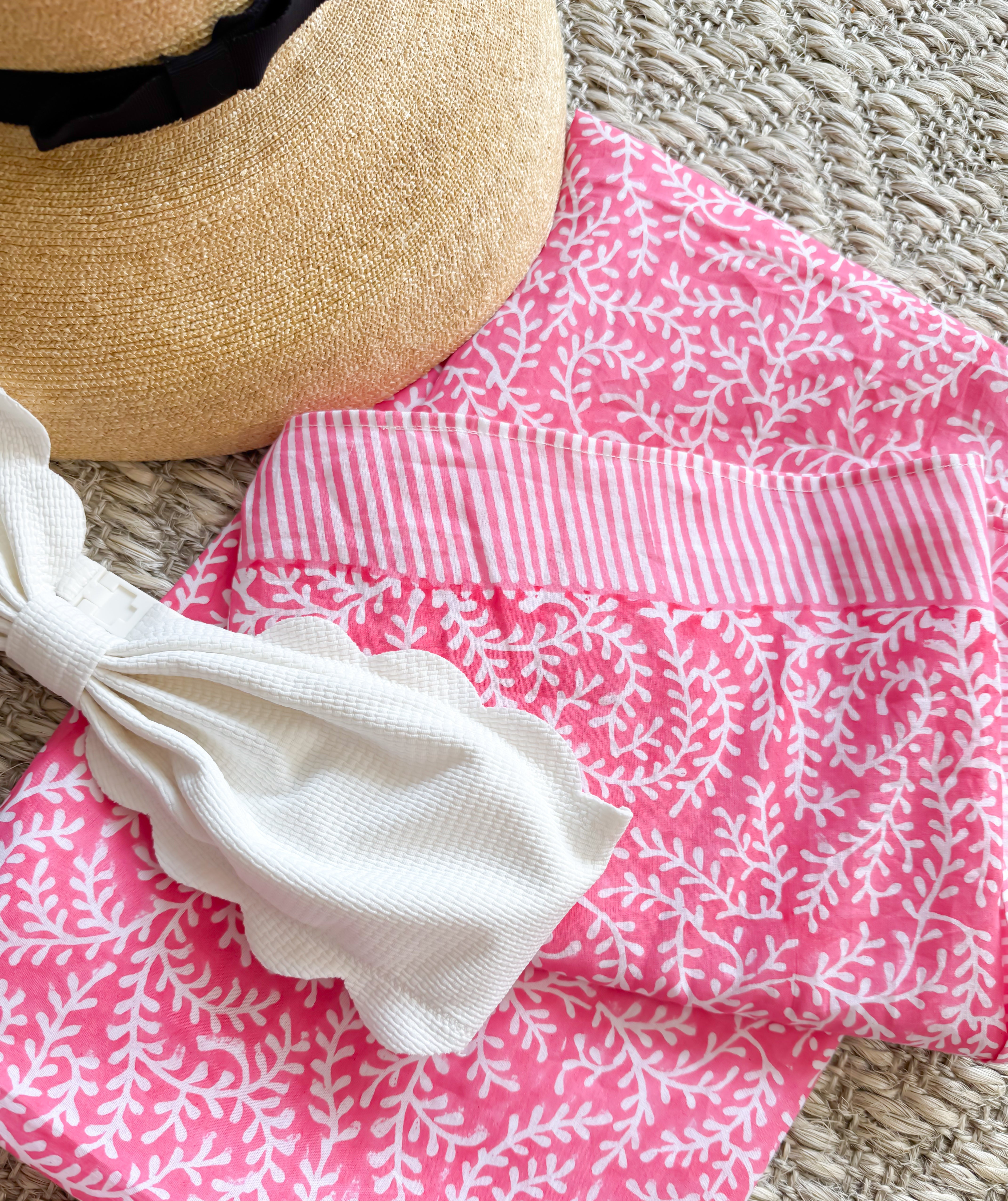 Meet our custom, fully hand-blocked Peony Fern print. This classic motif in our favorite shade of pink with timeless stripe border can be worn multiple ways—taking you from the oceanside to sunset spritzers.