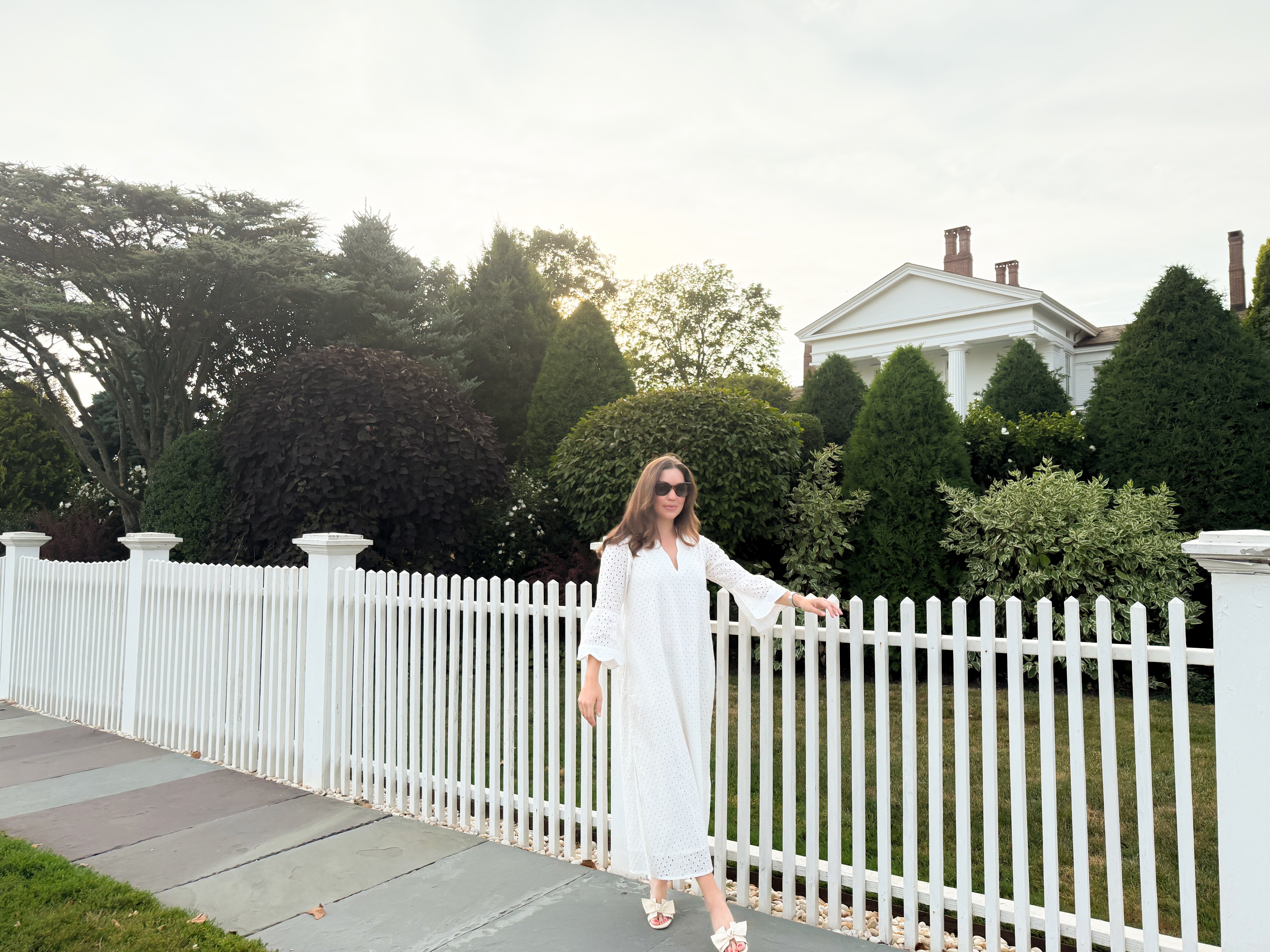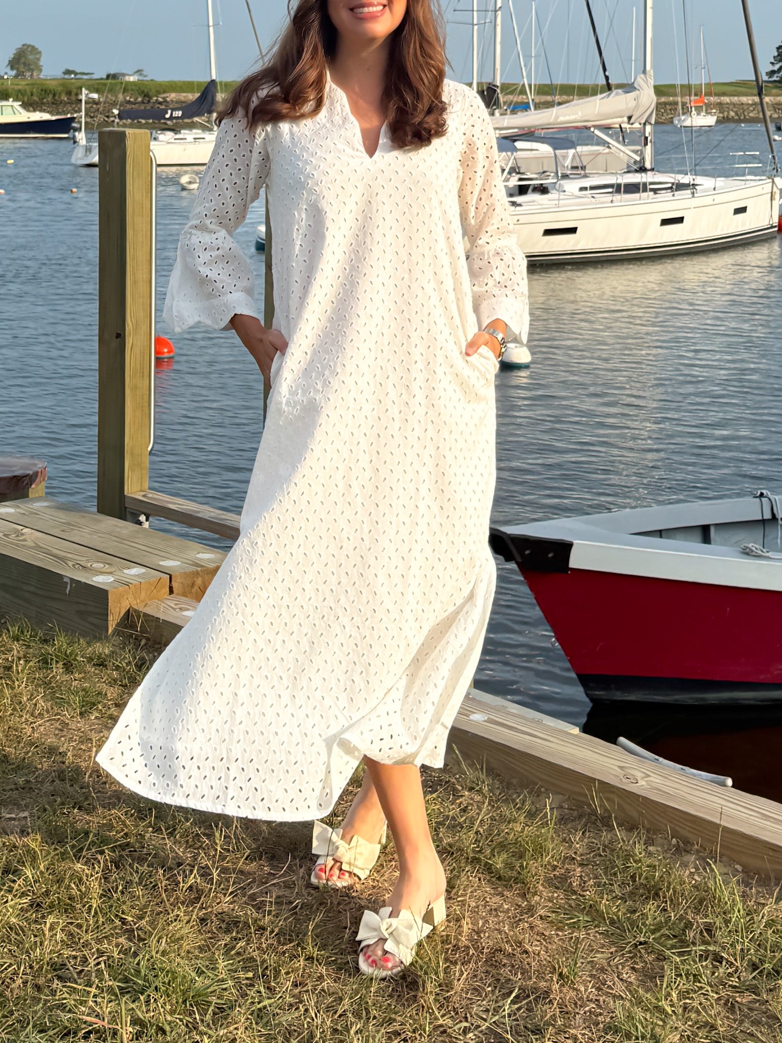 An effortless, transitional staple with a scallop twist, the Amy caftan is a timeless silhouette infused with fresh details & custom design. A classic eyelet motif allows for a touch of texture, and a beautiful ivory tone extends its versatility. A unique, hand-cut scallop neckline and scalloped-trim bell sleeves add a touch of whimsy and effortless femininity to this flattering shape.