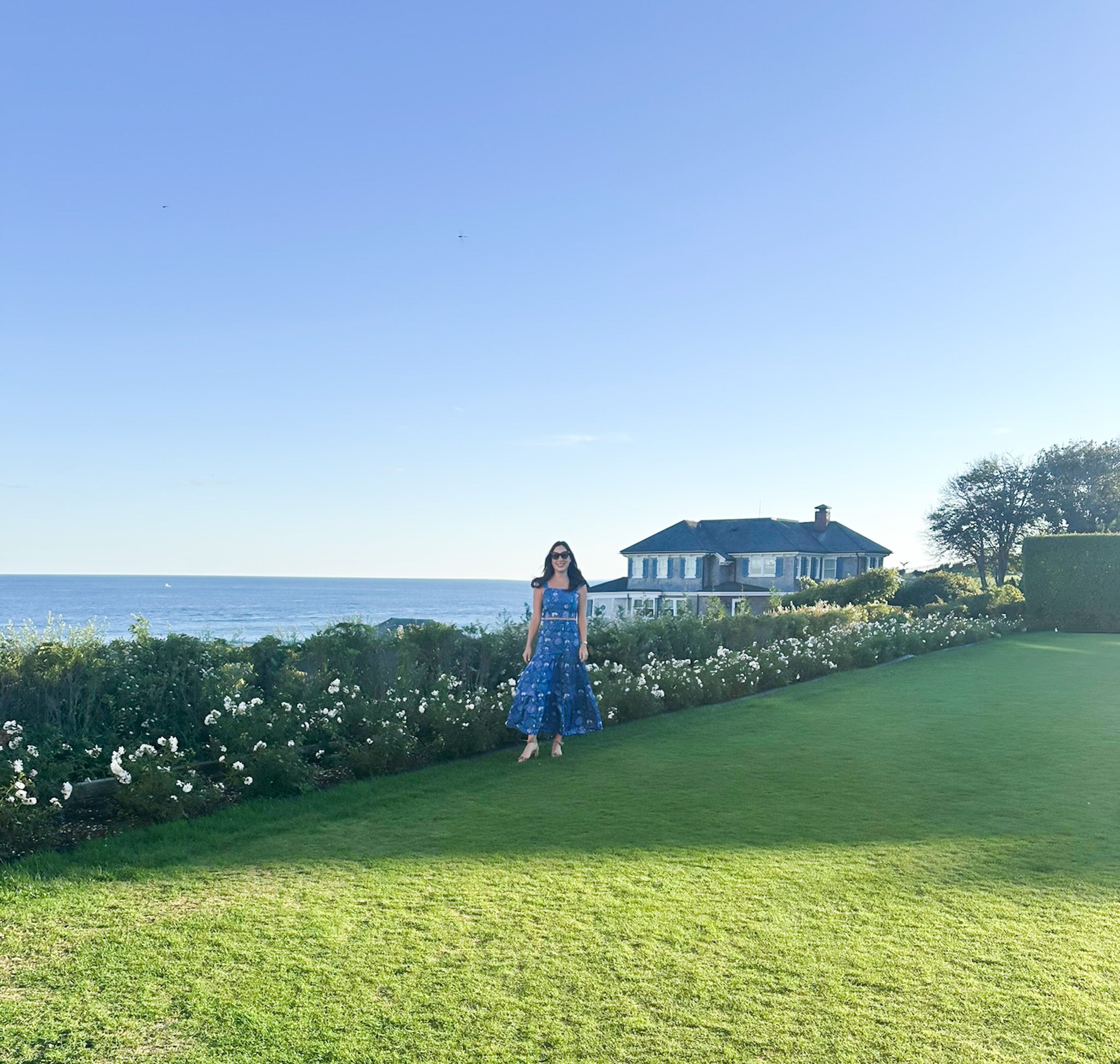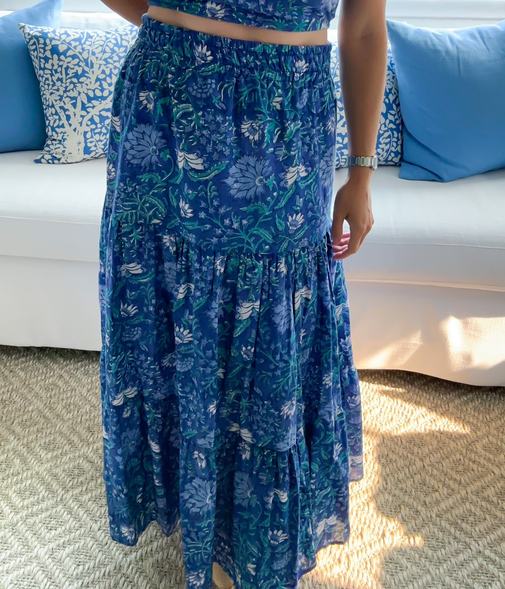 Our Southport Set in a gorgeous deep azure tone with periwinkle & teal hand-blocked floral accents is a year-round stunner. The skirt features a flattering and comfortable high-waisted elastic band, fitted hip area & tiered flounce drop - we're living in this set from day to night.